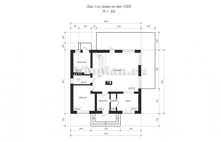 Проект индивидуального одноэтажного жилого дома с размерами 9,04х10,04 м.